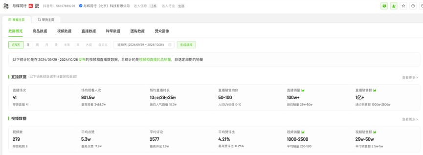 因“文化人”人設(shè)崩塌,并且頻頻“背刺”消費(fèi)者,董宇輝的號召力已不復(fù)當(dāng)年勇。飛瓜數(shù)據(jù)顯示,2024年9月29日-2024年10月28日,與輝同行直播銷售額僅為1億 ,遠(yuǎn)低于獨(dú)立初期數(shù)億元的月銷售額。