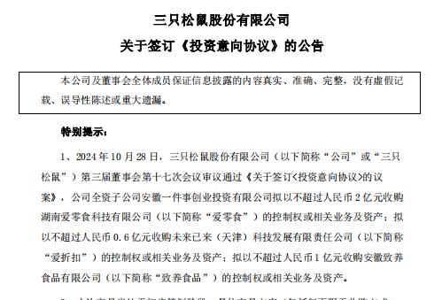 其中,三只松鼠收購“愛零食”“愛折扣”和致養(yǎng)食品的《投資意向協(xié)議》引起廣泛關注。