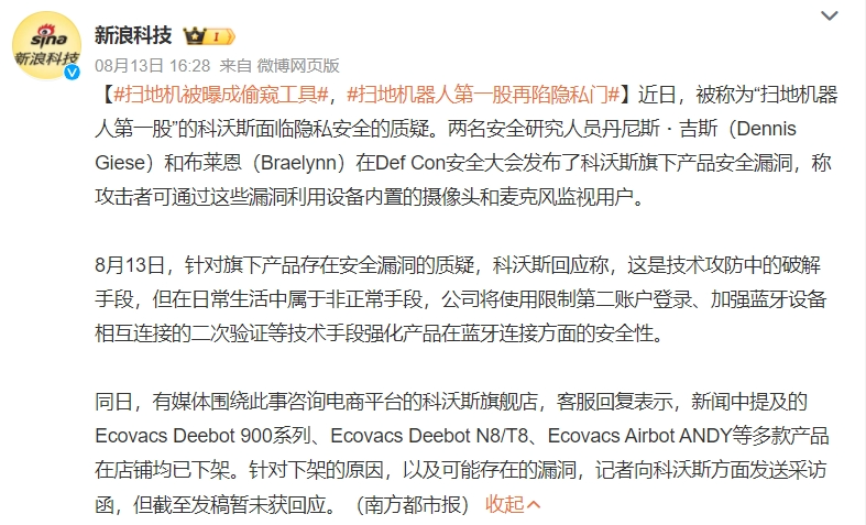除了在質(zhì)量問題上頻遭投訴,科沃斯近期又被發(fā)現(xiàn)存在隱私安全漏洞。今年8月,在一年一度的被譽(yù)為“黑客奧斯卡”的Def Con安全大會(huì)上,兩名安全研究人員發(fā)現(xiàn)科沃斯旗下多款掃地機(jī)器人、割草機(jī)器人產(chǎn)品存在安全問題:任何人只要使用手機(jī),就能通過藍(lán)牙從450英尺(約130米)遠(yuǎn)的地方連接并控制科沃斯掃地機(jī)器人。一旦實(shí)現(xiàn)控制,黑客可以通過讀取Wi-Fi憑證,讀取所有保存房間的地圖、攝像頭、麥克風(fēng)等等。