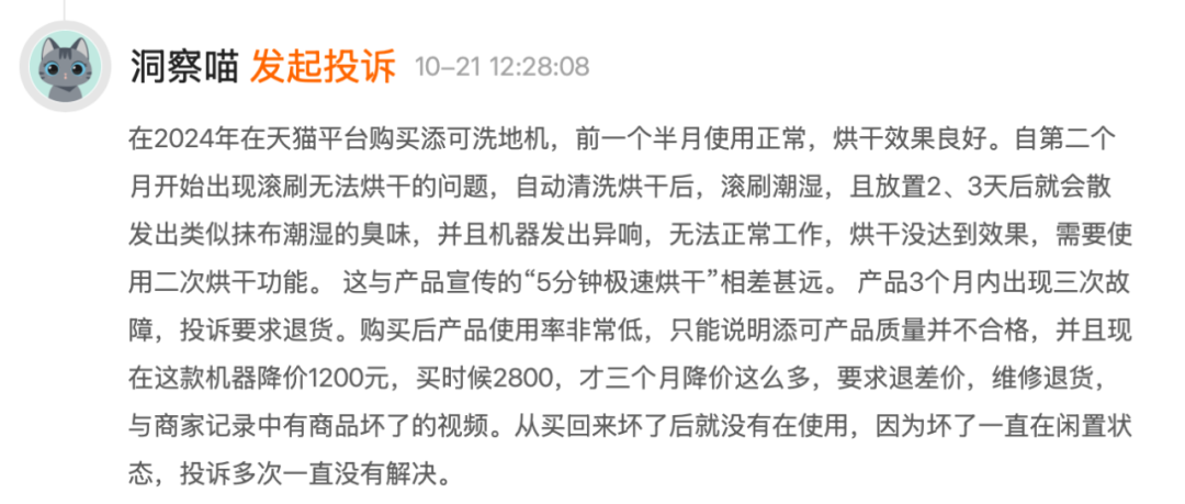 另一方面,作為科沃斯高端路線的添可,也在逐漸暴露出產(chǎn)品質(zhì)量方面的問題。在“黑貓投訴”平臺(tái)上可以發(fā)現(xiàn),包含“添可”關(guān)鍵詞的相關(guān)投訴內(nèi)容多達(dá)8500多條,遠(yuǎn)超過“科沃斯”4000多條的投訴內(nèi)容;其中投訴大多涉及電池充電故障、電機(jī)容易壞、拖地時(shí)漏臟水等問題,甚至有用戶近期投訴稱“添可洗地機(jī)3個(gè)月內(nèi)出現(xiàn)3次故障”且“買后3個(gè)月降價(jià)1200元”。