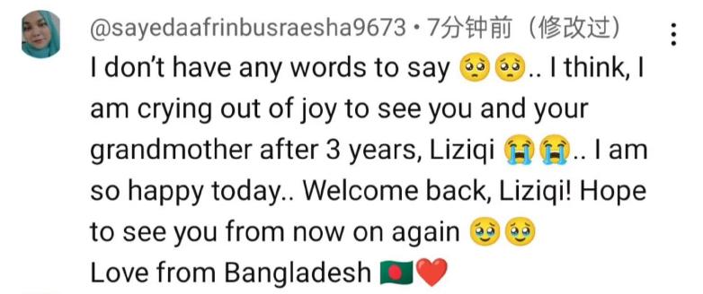 孟加拉國網(wǎng)友表示:我不知道該說什么了,我想我是因為高興哭了,時隔三年再次見到你和你的奶奶,今天我真的很開心,歡迎回來,李子柒!希望從現(xiàn)在開始能再次見到你。