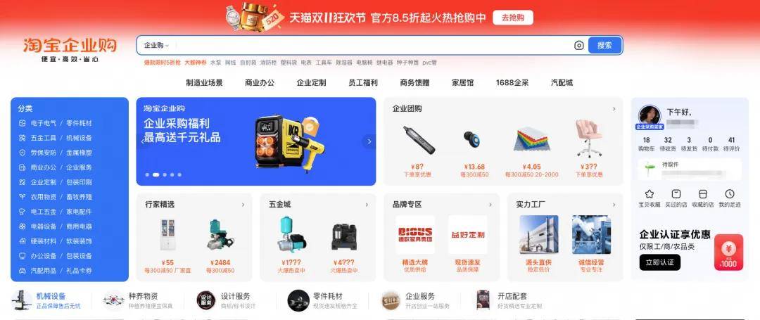 雙11期間,《天下網(wǎng)商》專訪了淘寶企業(yè)購負(fù)責(zé)人天德。天德介紹,淘寶企業(yè)購招募了工業(yè)品、電子元器件、辦公家具、包裝、開店配套、定制營銷物料、農(nóng)資農(nóng)具等行業(yè)的優(yōu)質(zhì)供給,引入超6000家知名品牌和專精特新企業(yè)。未來,淘寶企業(yè)購還將針對采購細(xì)分場景引入更多垂類知名品牌和源頭工廠,進(jìn)一步豐富供給,并完善企業(yè)買家權(quán)益,打造“要采購,上淘寶”的市場心智。