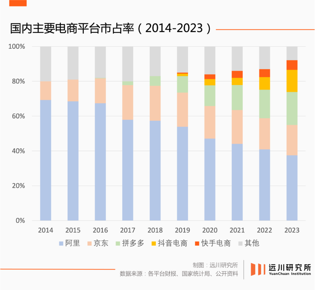 在2014年,僅阿里和京東兩家公司的GMV總和就占到了中國電商行業(yè)總規(guī)模的80%,斷崖式領先第二梯隊的電商公司。但十年后的2023年,昔日的“喋血雙雄”變成了“五軍之戰(zhàn)”,組成80%占比的公司擴大到了5家:32%的阿里、17%的拼多多、15%的京東、11%的抖音和5%的快手。