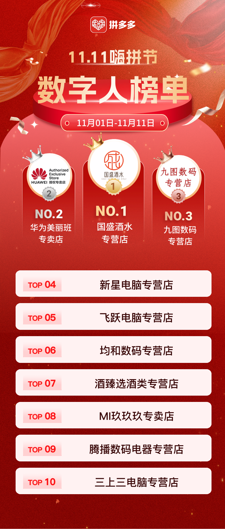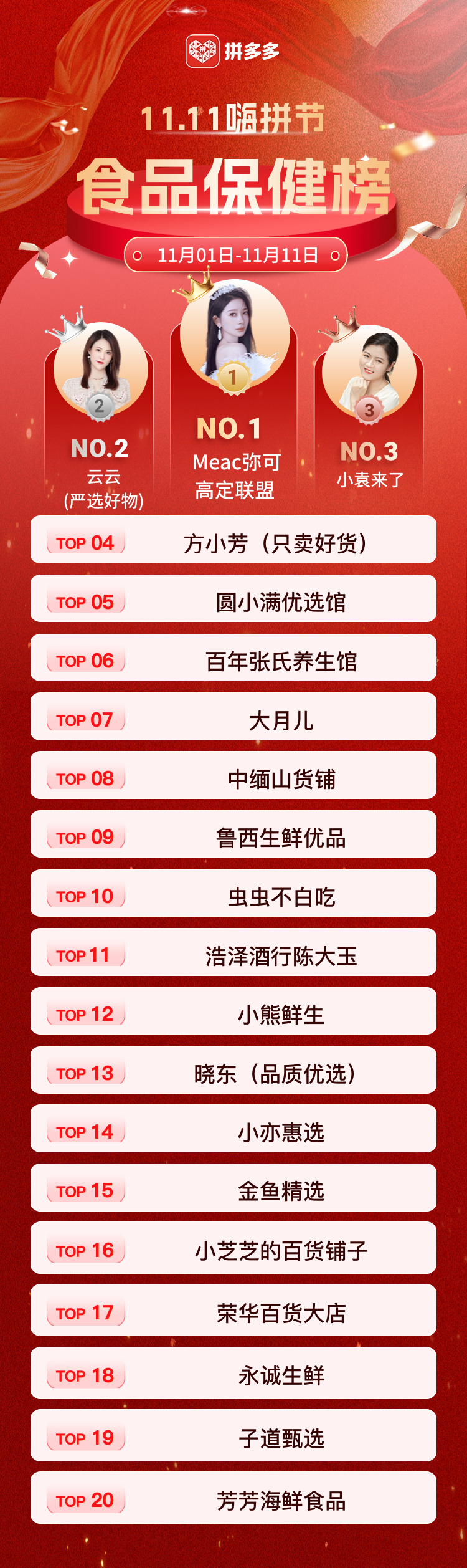 在今年官方曝光的雙11總榜前二十名中,多為拼多多的達人主播或白牌店鋪。