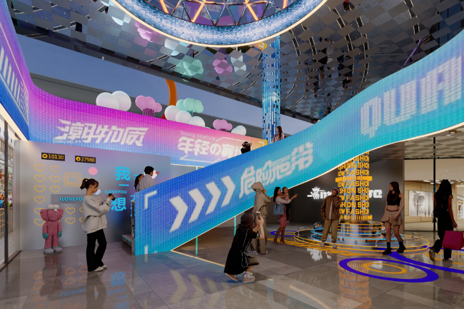 商場樓層布置上,定期更換的藝術(shù)美陳,并一應(yīng)俱全地滿足消費(fèi)者“逛吃”購買和打卡拍照的需求,進(jìn)一步達(dá)成“二次元+零售+美食+潮玩”的跨界合作。
