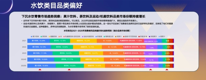 從品類偏好來看,判斷2025年,果汁飲料、茶飲料及運/機(jī)能飲料品類會保持持續(xù)的市場份額增長,看到最后一行,紅三角的子類目是表示會增長的。從區(qū)域市場來分析,我們判斷2025年北方地區(qū)水飲類目銷售增速將會持續(xù)領(lǐng)跑全球。