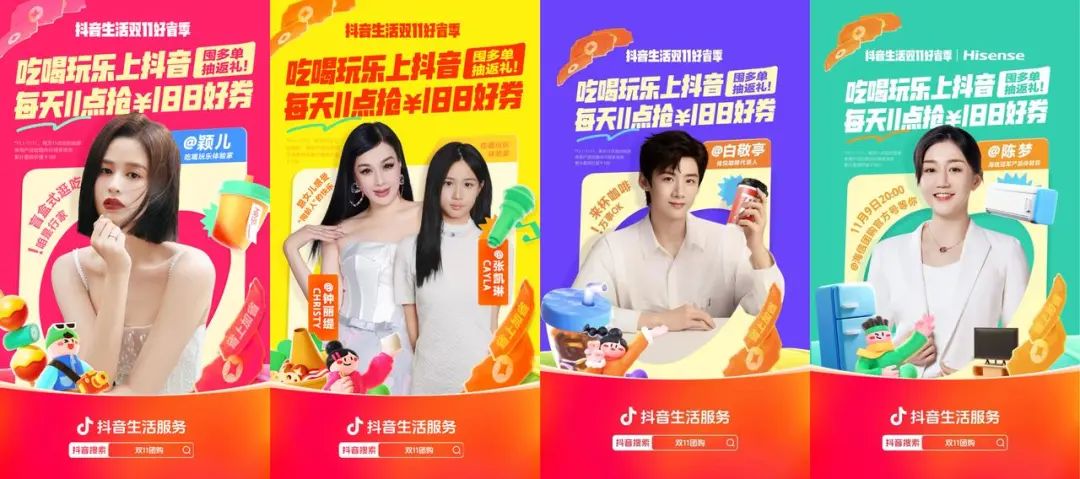 自帶流量的明星們?yōu)殡p11帶來了更高的關(guān)注度,也讓抖音生活服務(wù)跨出了原本的剛需人群圈層,吸引到更多的潛在用戶,更大地打開了線上的流量入口;而在種草之后,利用高點直播活動承接流量轉(zhuǎn)化成交,抖音生活服務(wù)又進一步夯實了“吃喝玩樂”的心智。