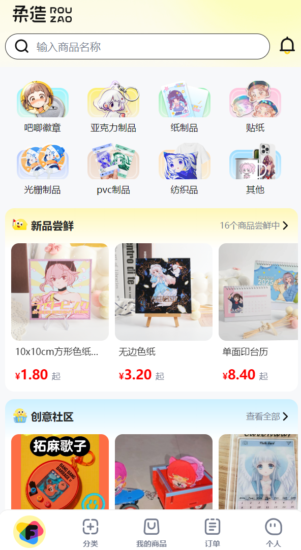 對于另外一部分具備一定的美工基礎(chǔ)、有更強烈的個性化需求的“谷子”玩家而言,他們還通過近來興起的柔造、映糖、谷倉工廠等小程序來進行定制。這些小程序為用戶提供了專門服務(wù)于周邊制作的制圖平臺和模板,用戶可自主設(shè)計定做并下單,小程序方協(xié)調(diào)工廠制作及發(fā)貨。