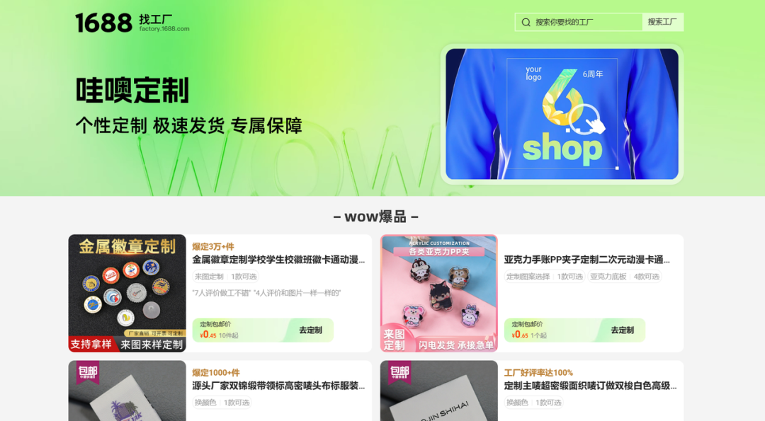 面對這些問題,平臺為定制類商品的供應(yīng)鏈整合提供了解決方案。今年年初,1688對“小單定制”板塊進行了升級,上線了“哇噢定制”專區(qū)。在這里,輕定制商品得到了篩選和流程標準化,買家找定制工廠的鏈路也進一步縮短。