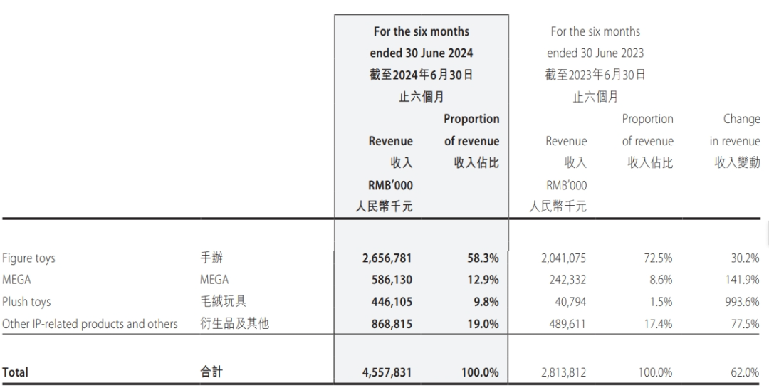 在今年半年報(bào)中,泡泡瑪特首次將產(chǎn)品細(xì)分為手辦、MEGA(俗稱(chēng)大娃)、毛絨玩具、衍生品及其他四大部分。