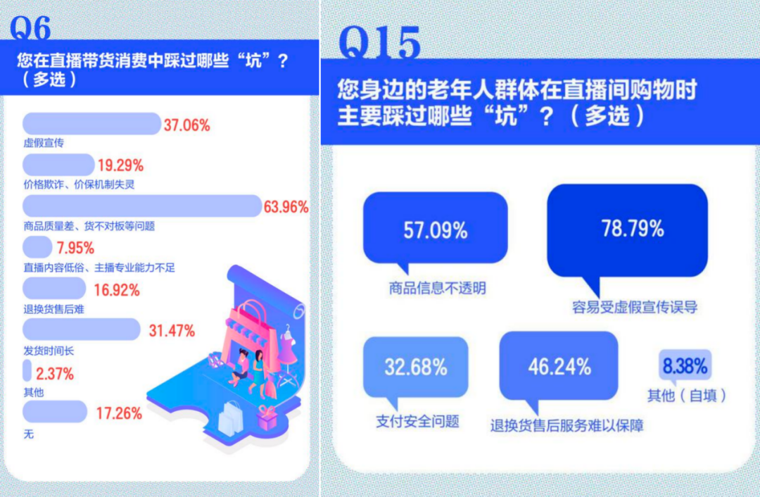 在售后問題解決過程中,主播、直播間客服成為主要絆腳石,超六成受訪者認為主播、直播間客服影響了售后問題的解決。不僅如此,虛假宣傳、商品信息不透明、售后難困擾著直播間的老年人。對于直播帶貨行業(yè)發(fā)展,受訪者更期待監(jiān)管、立法和平臺出手。