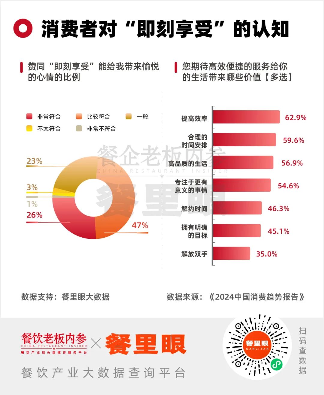 《2024中國(guó)消費(fèi)趨勢(shì)報(bào)告》中提到,消費(fèi)者對(duì)及時(shí)滿足和便捷服務(wù)的需求越來越高,這種趨勢(shì)不僅僅體現(xiàn)在零售和電商領(lǐng)域,還廣泛影響到旅游、餐飲等行業(yè)。具體說來,消費(fèi)者更注重當(dāng)下時(shí)刻的快樂和滿足,而不是等待或計(jì)劃未來的某種結(jié)果,快速、便捷、智能、即刻享受的產(chǎn)品和服務(wù),才是讓他們?cè)诳鞎r(shí)代獲得從容慢生活的利器。