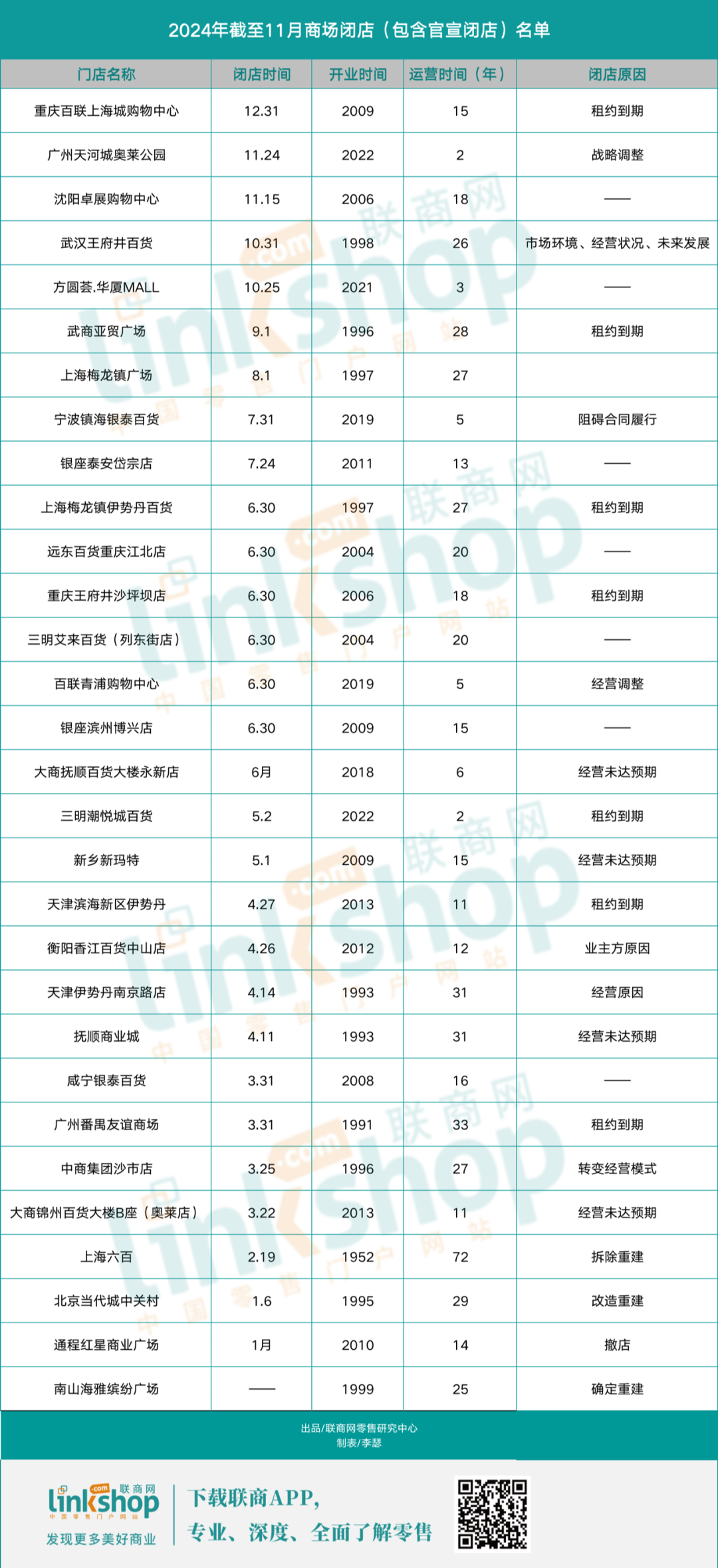 根據(jù)《聯(lián)商網(wǎng)》不完全統(tǒng)計(jì),2024年截至目前,已經(jīng)有30家商場(chǎng)宣布閉店(不包含升級(jí)改造),值得注意的是,“老百貨”依然是關(guān)店「重災(zāi)區(qū)」。