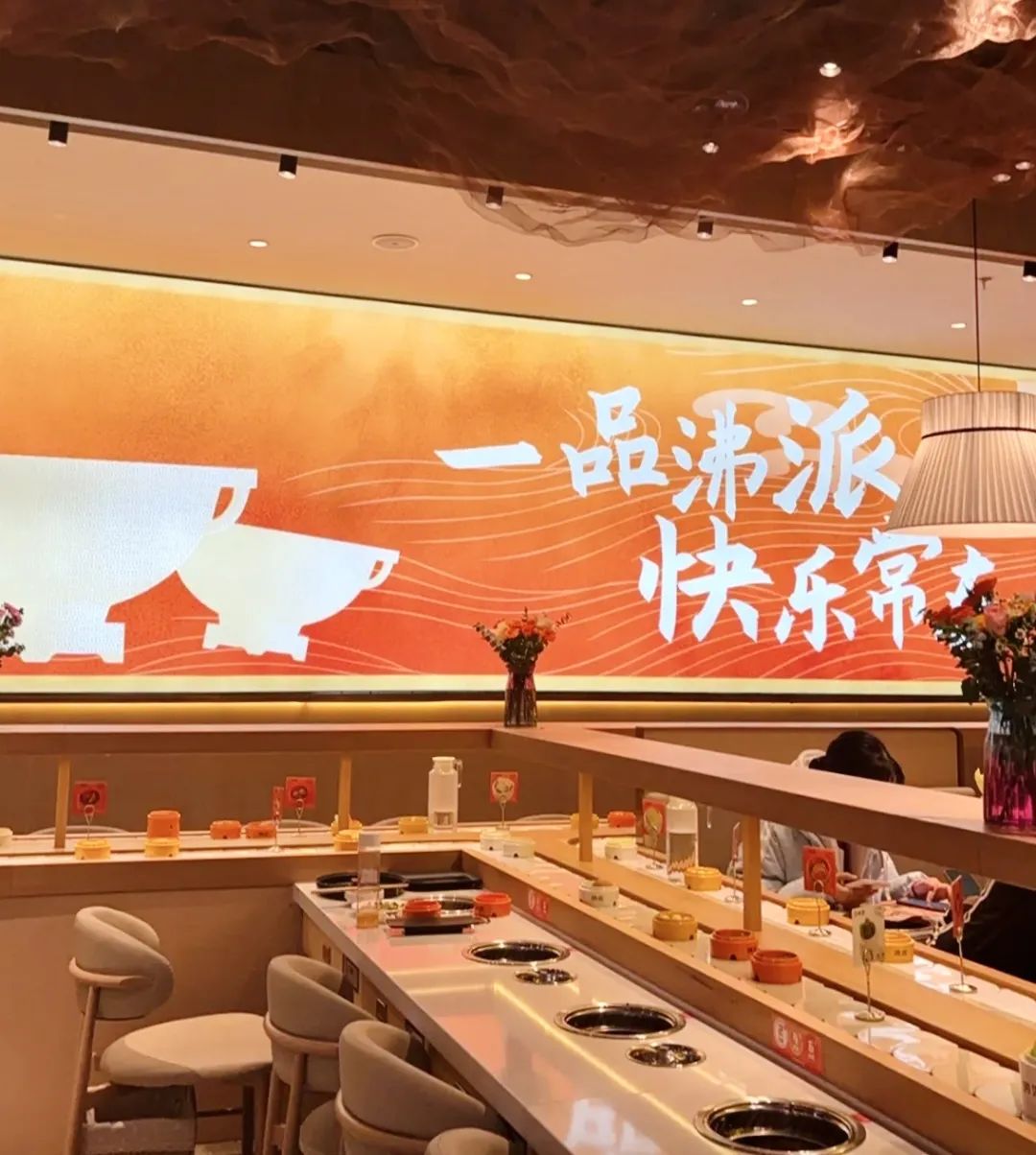 餐廳的門頭寫著“沸派·甄鮮火鍋”,不少地方寫著口號“一品沸派,快樂常在”。門店以橙黃色為主色調(diào),整體簡潔明亮,餐桌上還擺放了許多鮮花作為裝飾。