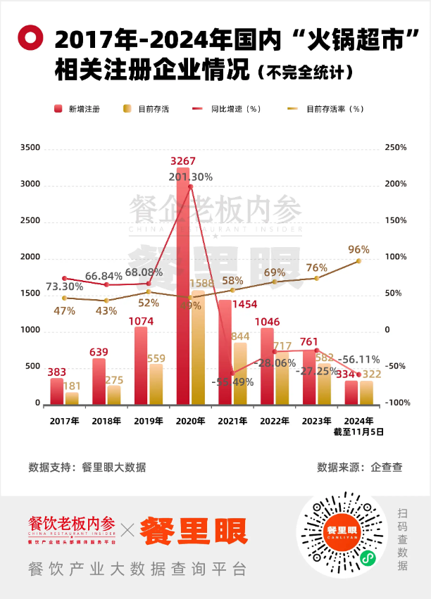 著眼于大盤數(shù)據(jù),企查查數(shù)據(jù)顯示,搜索關鍵詞為“火鍋超市”的新注冊企業(yè)數(shù)量自2020年達到頂峰3267家后就開始逐年下降,2020年注冊的企業(yè)如今只有1588家存活,存活率大概只有半成。