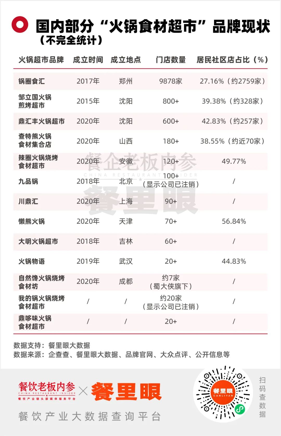 通過搜索和查詢,內(nèi)參君羅列出目前國內(nèi)經(jīng)營“火鍋食材超市”的部分品牌信息,圖表如下: