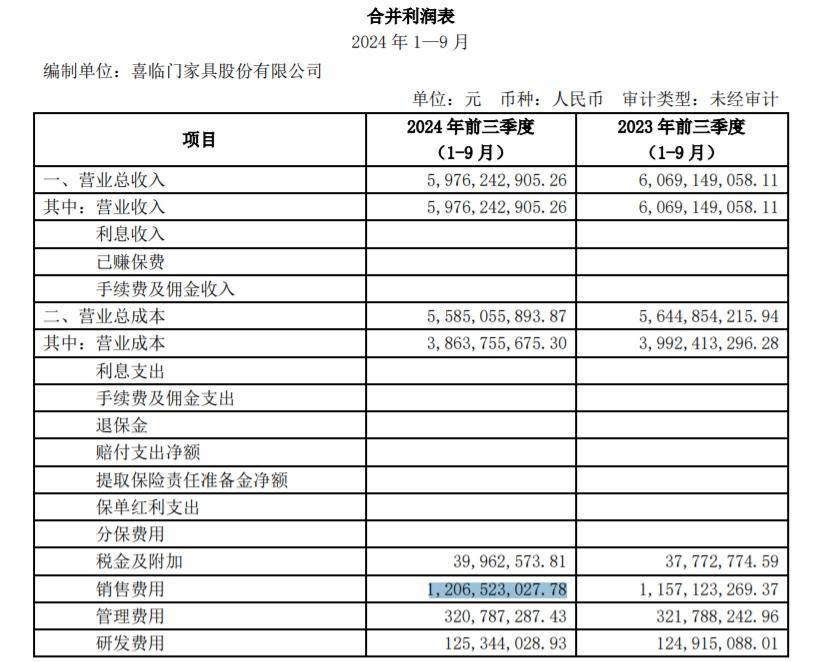 打造高端子品牌,意味著更高的營(yíng)銷投入。由上述品牌活動(dòng),就能看到喜臨門的財(cái)大氣粗,而這也反映到喜臨門的財(cái)報(bào)上——2024年前三季度,公司的銷售費(fèi)用高達(dá)12.07億元,同比增長(zhǎng)4.27%。但從效果來看,喜臨門比去年同期花費(fèi)了更高的銷售費(fèi)用,取得的營(yíng)收卻沒有去年同期高。