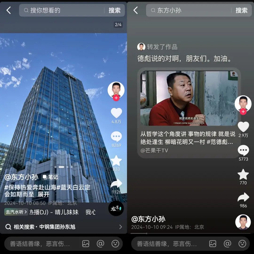 今年10月10日,近9個月沒有更新抖音賬號的孫東旭,通過抖音圖文曬出新東方總部大廈和中鋼大廈,以及一張自己拿著帽子的照片。評論區(qū)中,眾多東方甄選的粉絲表示“歡迎回歸”。
