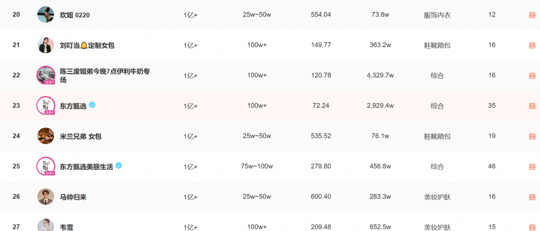 蟬媽媽數(shù)據(jù)顯示,以帶貨銷售額算,單飛的與輝同行一直占據(jù)著帶貨達(dá)人榜的前2名,多次登頂榜單第1。反觀東方甄選,在今年2月,東方甄選在帶貨達(dá)人榜上排名前4,隨后排名跌出前5,到了10月,東方甄選的排名跌到第23。