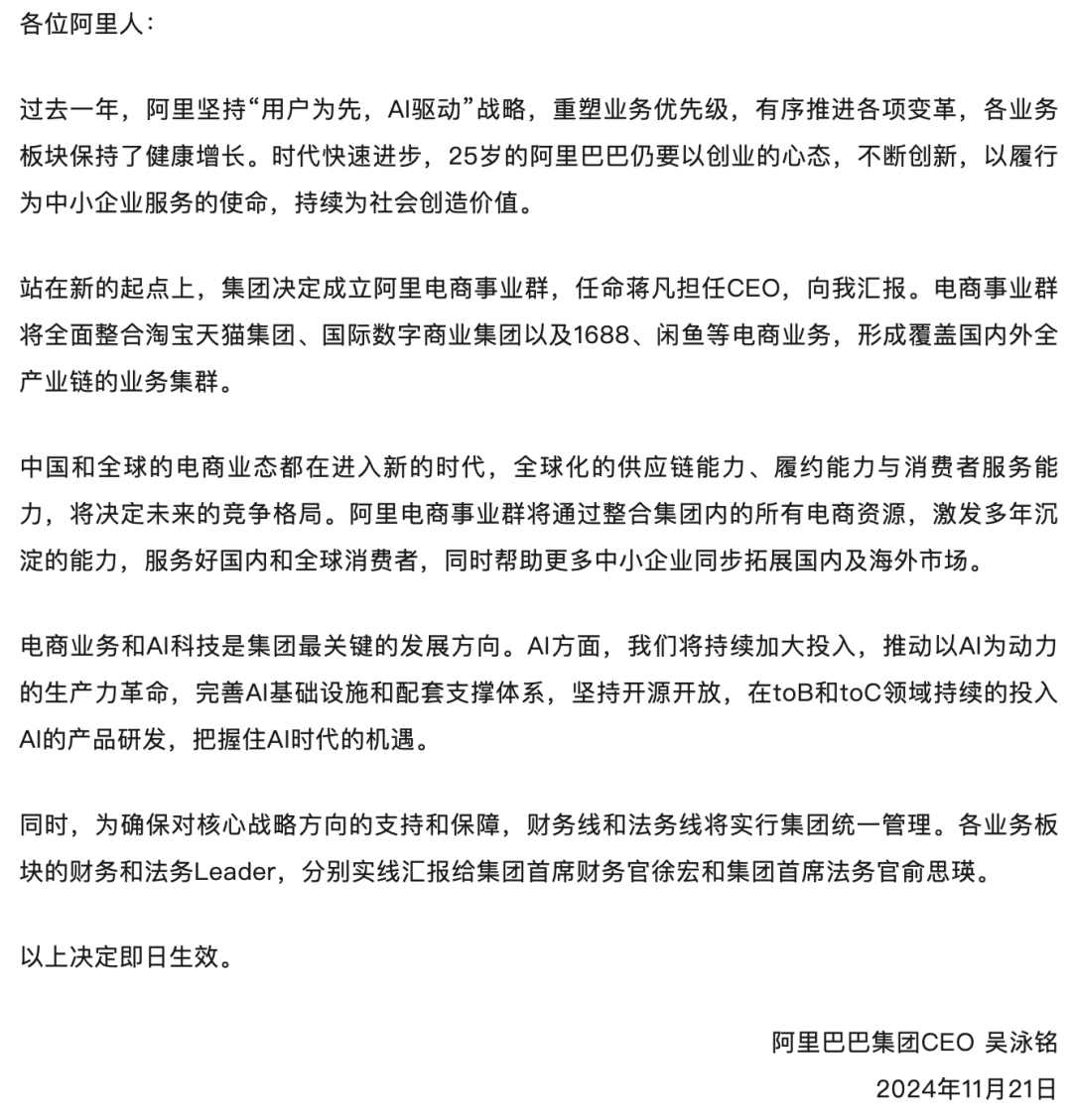 11月21日,阿里巴巴集團(tuán)CEO吳泳銘發(fā)布全員郵件,宣布成立阿里電商事業(yè)群(全面整合淘寶天貓集團(tuán)、國際數(shù)字商業(yè)集團(tuán)以及1688、閑魚等電商業(yè)務(wù)),并任命蔣凡負(fù)責(zé),向吳泳銘匯報。