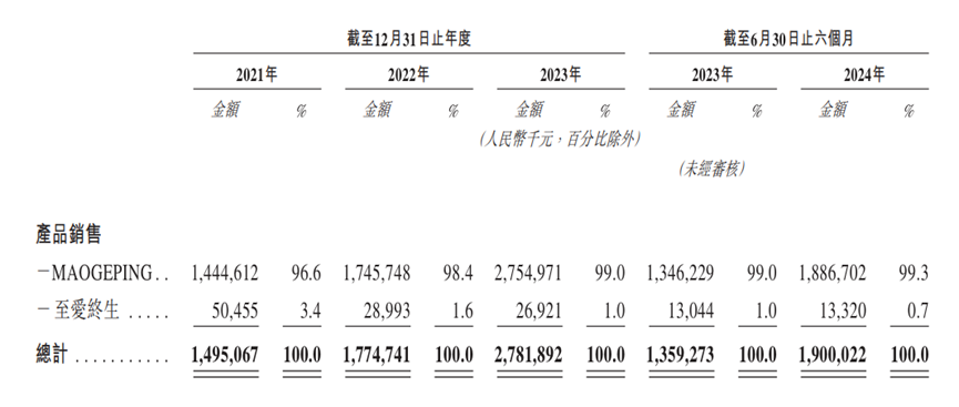 招股書顯示,毛戈平雖然有MAOGEPING、至愛(ài)終生化妝、培訓(xùn)等多條業(yè)務(wù)線,但主要依賴MAOGEPING業(yè)務(wù)創(chuàng)收。2024年上半年,MAOGEPING品牌營(yíng)收18.87億元,占總營(yíng)收的比重高達(dá)95.69%。