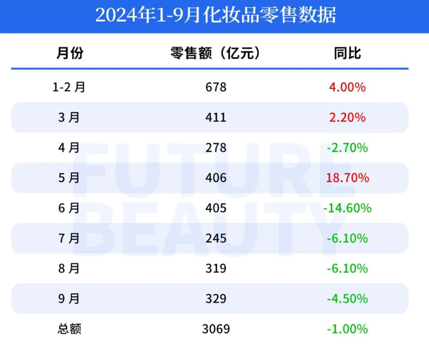 國(guó)家統(tǒng)計(jì)局披露的數(shù)據(jù)顯示,2024年前9個(gè)月,中國(guó)化妝品行業(yè)累計(jì)零售額為 3069億元,同比下跌1%,6月以來(lái)已連續(xù)下跌 4個(gè)月。其中9月零售額為 329億元,同比下跌 4.5%。