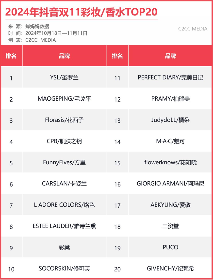 2022年雙十一,抖音彩妝/香水品牌TOP 10榜單中,毛戈平銷售額1550 萬(wàn)元,位列第九;2024年雙十一,抖音彩妝/香水品牌TOP 20榜單中,毛戈平躍居第二,僅次于圣羅蘭。