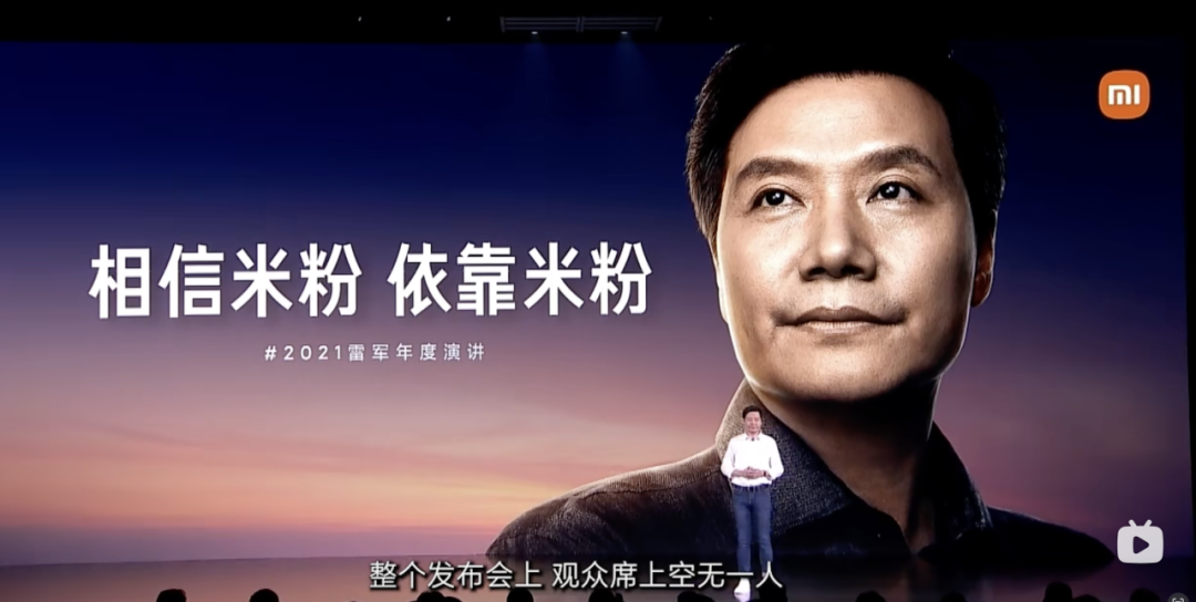 雷軍在2021年年度演講舞臺上,圖源:小米公司視頻截圖