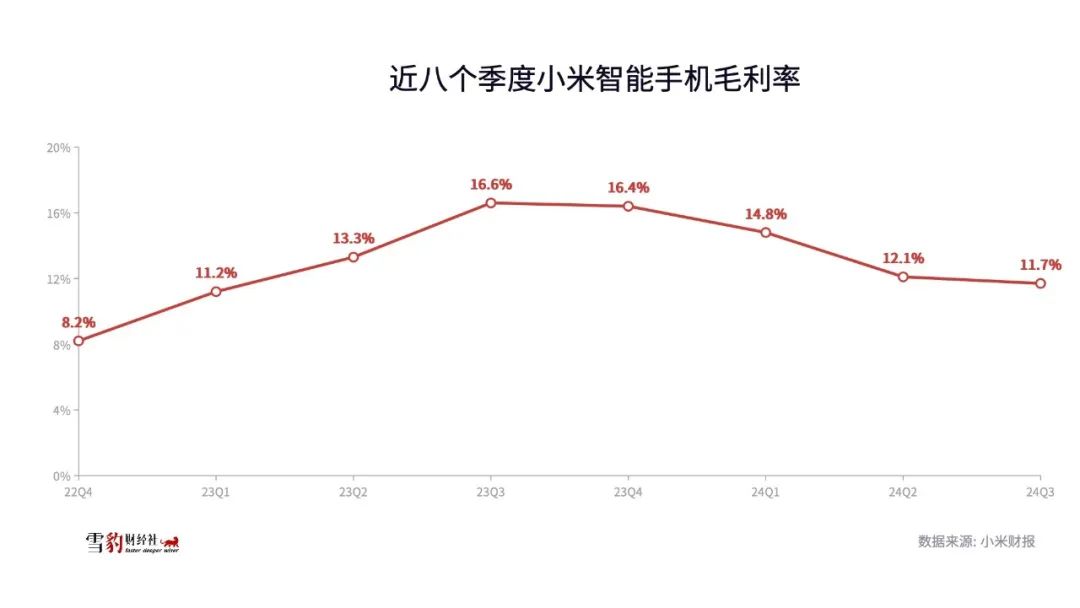 2024年前三個季度,小米智能手機(jī)業(yè)務(wù)的毛利率呈環(huán)比下跌態(tài)勢,分別為14.8%、12.1%、11.7%。作為對比,2024財年第四財季(自然年2024年第三季度),蘋果公司硬件端的毛利率為36.3%。