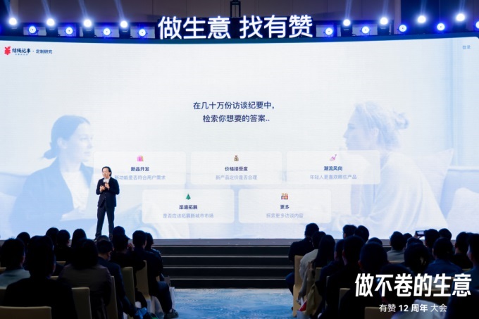 基于過去幾十萬份訪談記錄,有贊聯(lián)合結(jié)繩記事消費研究所,為商家提供消費調(diào)研報告,F(xiàn)在,通過有贊智能體,商家輸入行業(yè)概況、目標人群等調(diào)研需求,會自動跳出調(diào)研提綱,修改并確認后,系統(tǒng)會在數(shù)據(jù)庫匹配出有效問卷,并輸出完整的調(diào)研報告,同時也提供個性化定制化報告。