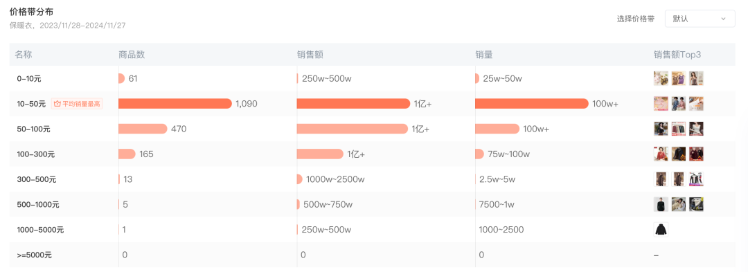為了提升銷量,眾多保暖內衣品牌紛紛采取低價競爭策略——當一款產品定價49元時,另一款相似產品便可能以39.9元甚至更低的價格,還有買一送一等促銷手段來吸引消費者。供給側市場越是成熟、競爭越是加劇,這種低價趨勢就愈發(fā)明顯。并且在此趨勢的影響下,消費者也形成了保暖內衣就應屬于這一低價區(qū)間的認知,并自然而然地選擇了價格最為常見的那些產品。根據(jù)蟬媽媽的數(shù)據(jù)統(tǒng)計,抖音平臺上最暢銷的保暖內衣價格區(qū)間正是10-50元。