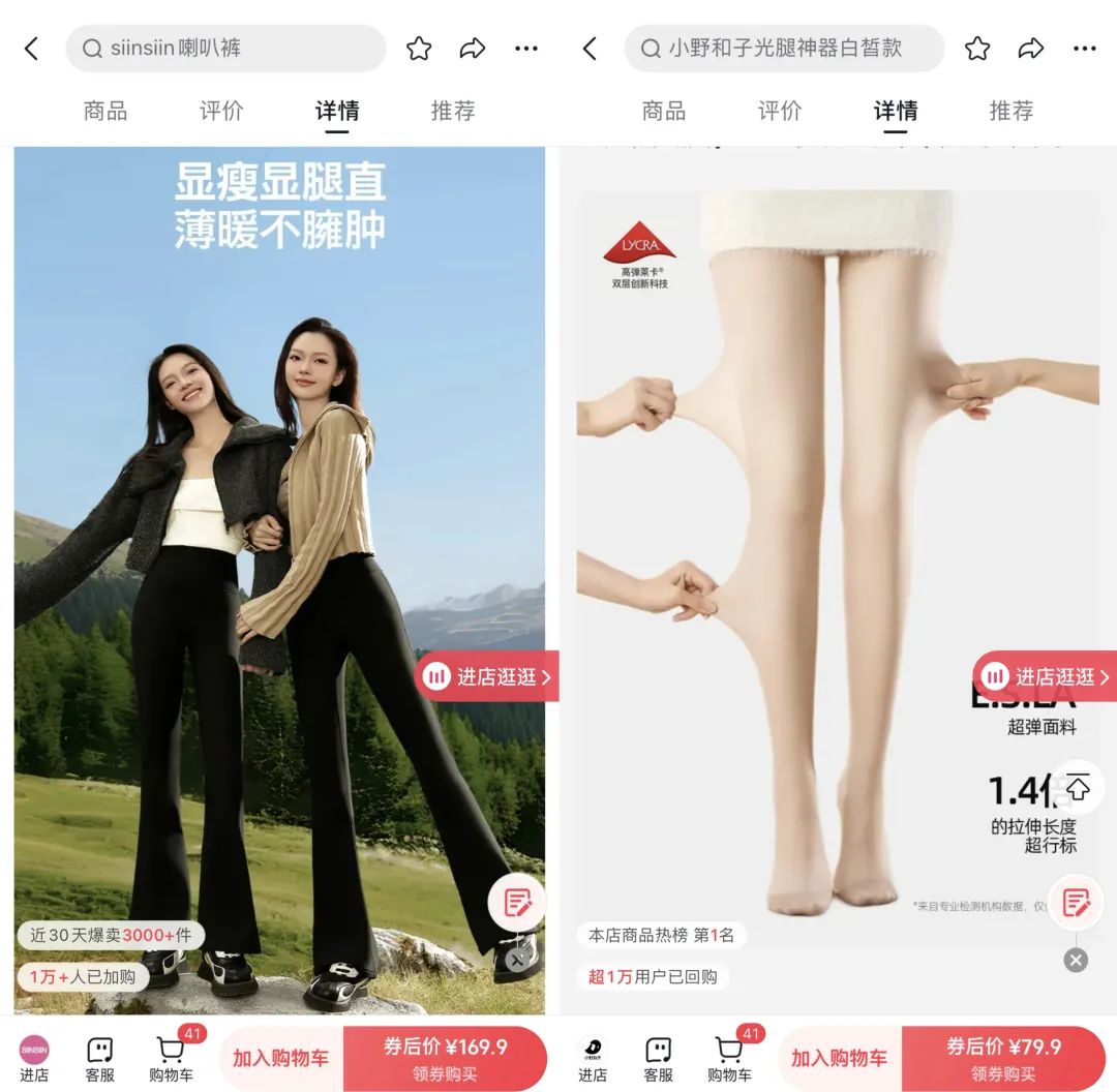 還有一類品牌,如sinsin、小野和子等等則敏銳地捕捉到了女性對塑身的需求,推出了可直接外穿的鯊魚褲、光腿神器、加絨黑絲等產品,來替代傳統(tǒng)無法外穿的秋褲和保暖褲。相較于單純的保暖功能,這些品牌的核心賣點在于其采用了獨特面料與版型剪裁技術,去實現(xiàn)顯著的塑形效果或是逼真的光腿視覺效果。這樣的創(chuàng)新設計,也能吸引到不少追求美麗與實用兼?zhèn)涞哪贻p女性消費者。