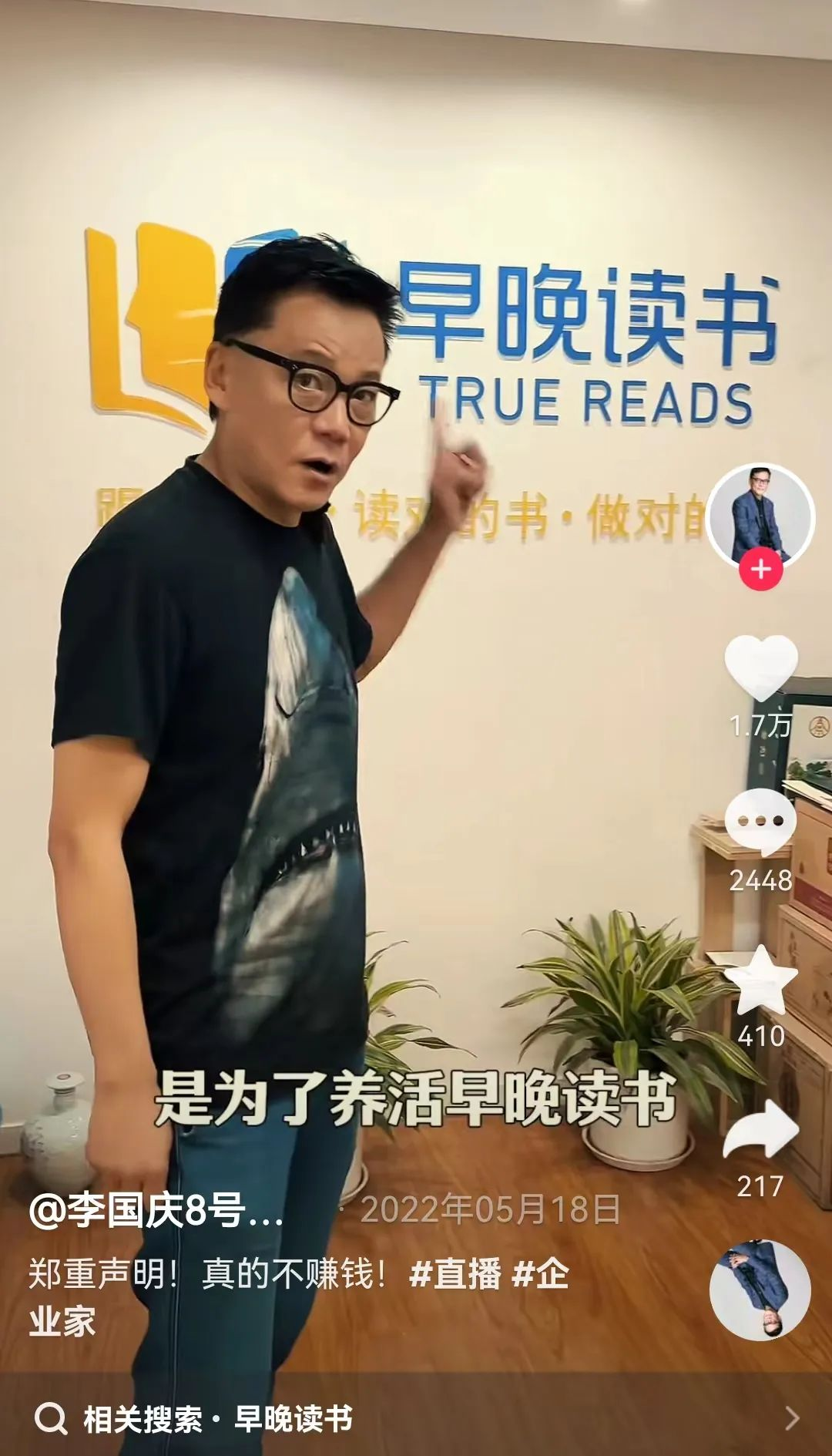 在2022年5月的一場直播中,李國慶聲明自己真的不賺錢,錢主要用來養(yǎng)活早晚讀書和直播公司,并自嘲“太寒酸了”,但又表示“這里裝著我的初心和夢想”。