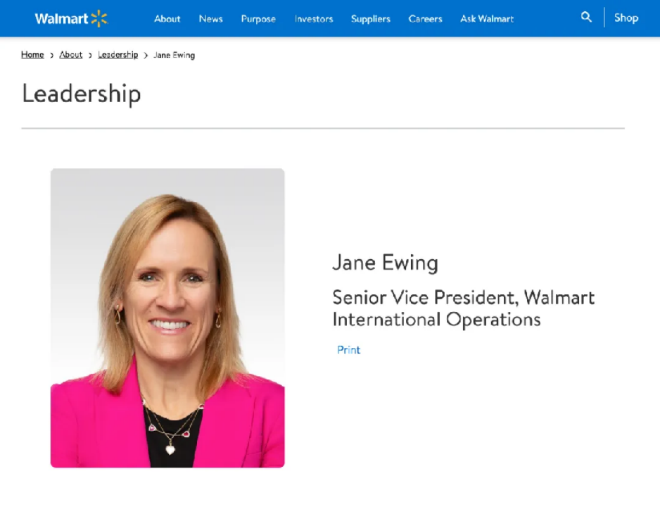 援引沃爾瑪方面的消息人士稱,Jane于2012年加入沃爾瑪,翻看其履歷,自2017年起,她擔任沃爾瑪國際部首席人力資源官,2020年調任沃爾瑪全球可持續(xù)發(fā)展高級副總裁。2024年1月,Jane Ewing回到沃爾瑪國際部擔任營運高級副總裁,分管營運、供應鏈、地產等部門。