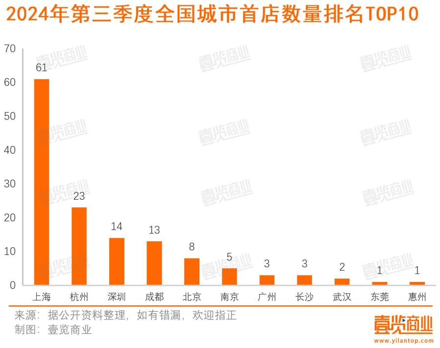具體到開店城市,上海仍是首店收割機(jī),落地61家首店;其次是杭州,共開出了23家首店;緊隨其后的深圳和成都,三季度分別開設(shè)了14家、13家首店。