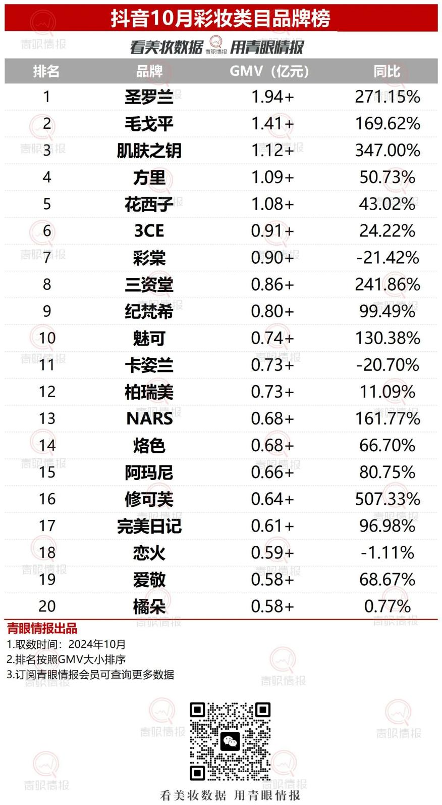 另據(jù)青眼情報(bào)顯示,抖音10月彩妝類目GMV超61.41億元,其中毛戈平以1.41億元+,同比增長169.69%的表現(xiàn),僅次于YSL,拿下抖音10月彩妝類目品牌榜第二位。