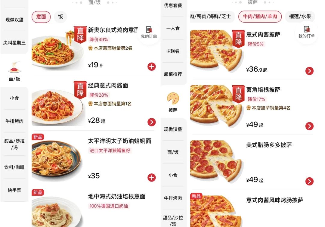 其中披薩系列有3款產(chǎn)品降價(jià),包括39元的德克薩斯風(fēng)味烤肉披薩,較之前下降20%;還有36.9元的意式肉醬披薩,較之前下降5%;薯角培根披薩現(xiàn)價(jià)為49元,價(jià)格下降17%。