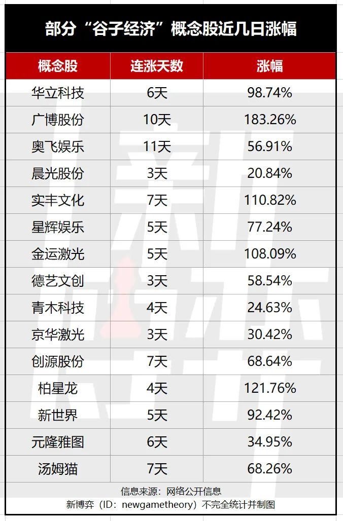 據(jù)新博弈不完全統(tǒng)計(jì),近幾日,包括華立科技、奧飛娛樂(lè)、星輝娛樂(lè)等在內(nèi)的多個(gè)“谷子經(jīng)濟(jì)”概念股漲幅都在50%以上,實(shí)豐文化、廣博股份等更是連續(xù)多日拉出漲停板,其中,廣博股份的漲幅超過(guò)180%。