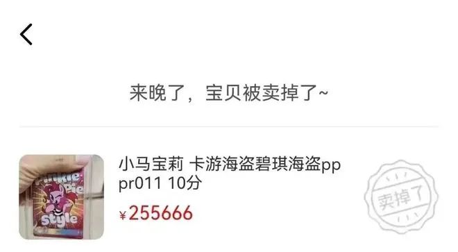 同時(shí),為了更大程度帶動(dòng)消費(fèi),大多“谷子”帶有收集、收藏的屬性,在二手交易市場(chǎng),一些稀有品甚至能賣到幾千乃至上萬(wàn)的價(jià)格。前不久,有消息稱一張名為“海盜碧琪PR卡”的小馬寶莉卡牌,在二手平臺(tái)以255666元的價(jià)格成交,不斷炒高的價(jià)格使“谷子”有了“塑料黃金”之稱,“谷子”外顯的增值能力,也在一定程度上刺激了更多人群入局。