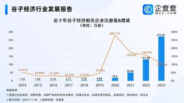 企查查數(shù)據(jù)顯示,自2020年起,“谷子經(jīng)濟(jì)”相關(guān)企業(yè)注冊(cè)量開(kāi)始出現(xiàn)明顯增長(zhǎng),至2023年,全年注冊(cè)量同比增長(zhǎng)106.70%至272.81萬(wàn)家,創(chuàng)注冊(cè)量新高。高速增長(zhǎng)下,國(guó)內(nèi)目前現(xiàn)存“谷子經(jīng)濟(jì)”相關(guān)企業(yè)近600萬(wàn)家。