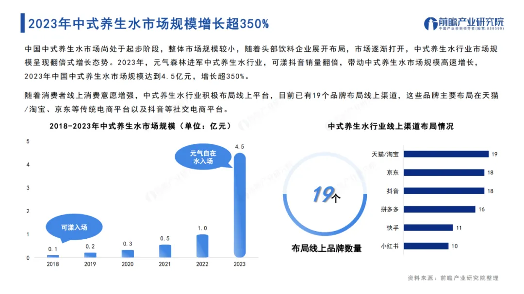 據(jù)前瞻產(chǎn)業(yè)研究院所發(fā)布的《2024年中國中式養(yǎng)生水行業(yè)發(fā)展趨勢洞察報告》顯示,2023年我國中式養(yǎng)生水市場規(guī)模為4.5億,同比增長超過350%,預計到2028年將會突破百億大關。