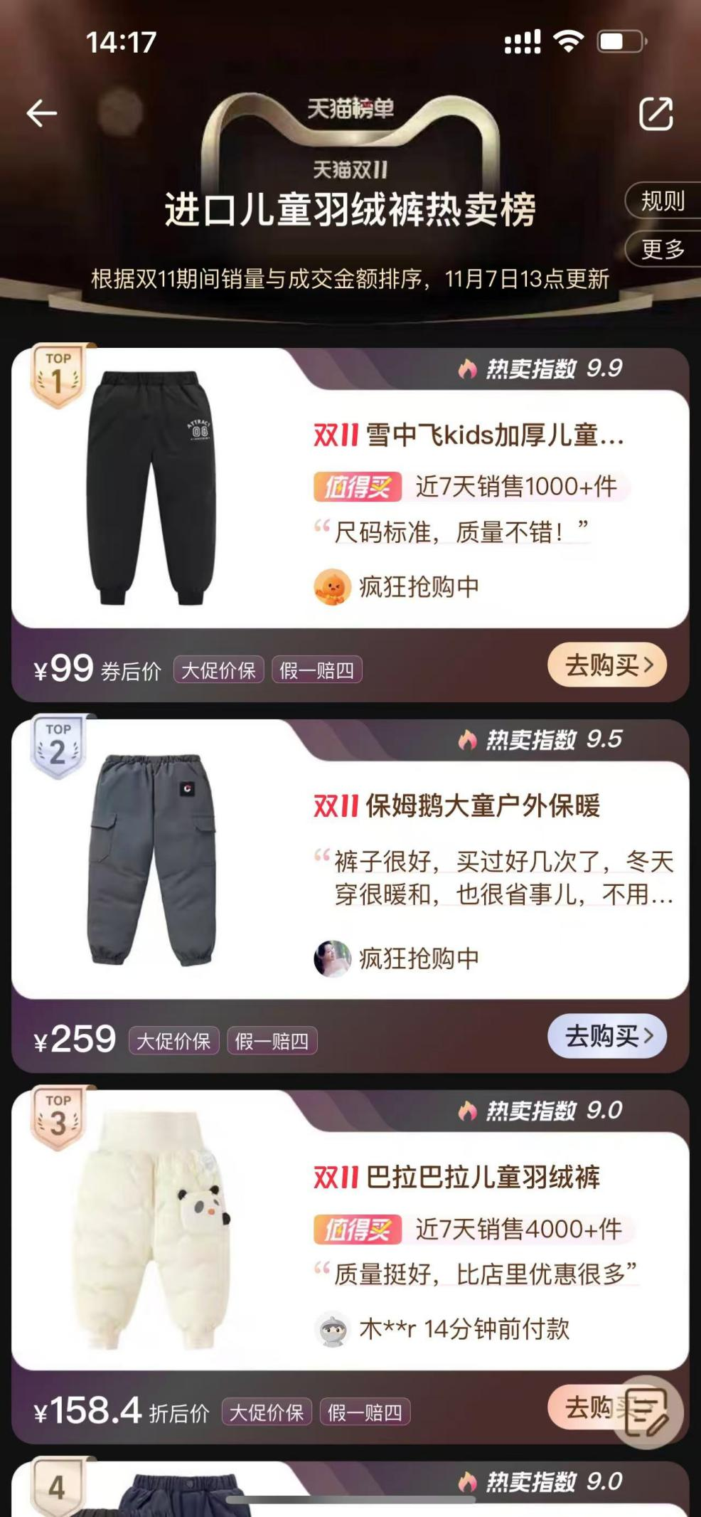 值得注意的是,整個童裝榜單被羽絨服與褲子兩大品類收割完畢,且羽絨服占據(jù)了前3,TOP1與TOP2均被保姆鵝旗艦店拿下。而入榜的4款羽絨服中有3款都來自保姆鵝旗艦店,整體售價比較具有性價比,主要集中在269到339元區(qū)間內(nèi)。