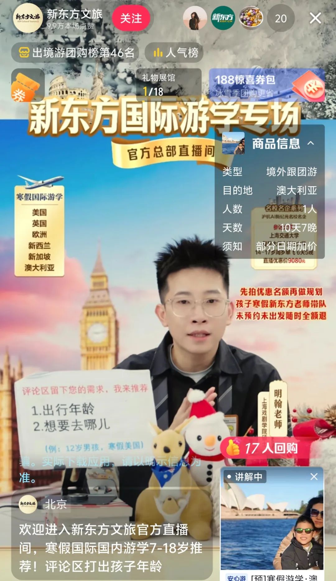 在抖音,“新東方文旅”粉絲量超70萬,已售出團(tuán)購商品1萬+,其中,價格為5000元的寒假游學(xué)·哈佛耶魯常青藤+十大名校+東西海岸拼團(tuán)14天12晚跟團(tuán)游銷量超500份。不過仍有大部分高客單價的產(chǎn)品銷量為個位數(shù)。