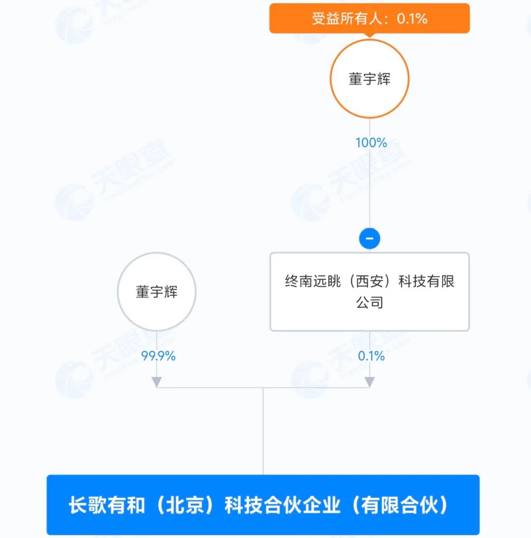 合伙人信息顯示,該企業(yè)由董宇輝、終南遠(yuǎn)眺(西安)科技有限公司(簡稱“終南遠(yuǎn)眺”)分別出資99.9%、0.1%。