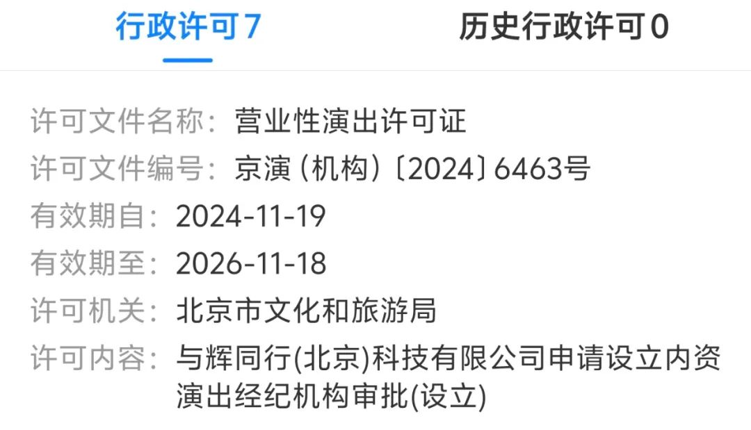 近期,與輝同行(北京)科技有限公司成功獲得MCN資質(zhì)許可證,經(jīng)營范圍涵蓋了經(jīng)營演出及經(jīng)紀(jì)業(yè)務(wù)、演出票務(wù),有效期將持續(xù)至2026年11月18日。