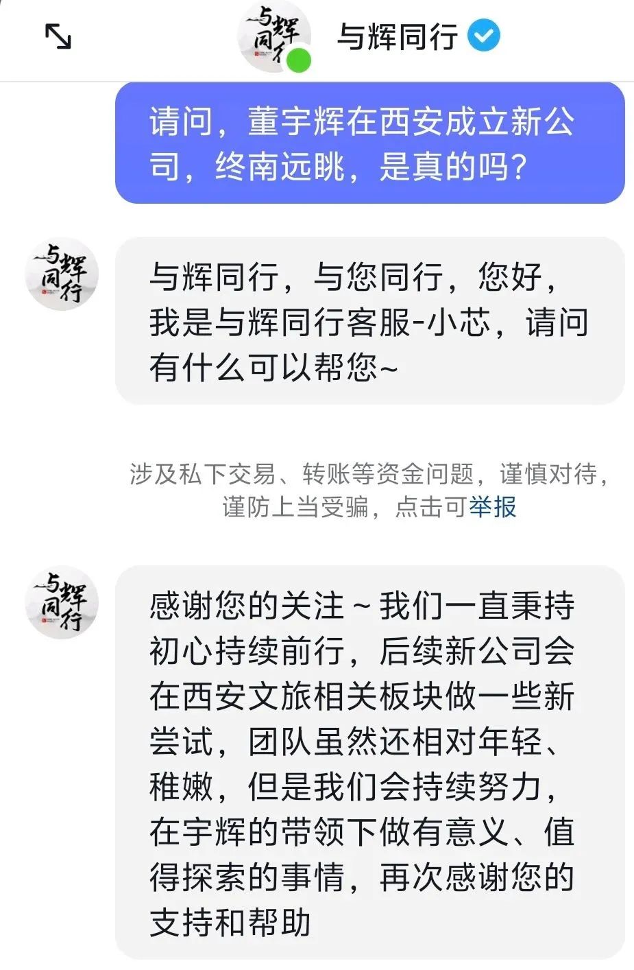 對于新公司的成立,“與輝同行”客服回應(yīng):“我們一直秉持初心持續(xù)前行,后續(xù)新公司會在西安文旅相關(guān)板塊做一些新嘗試,團(tuán)隊雖然還相對年輕、稚嫩,但是我們會持續(xù)努力,在宇輝的帶領(lǐng)下做有意義、值得探索的事情!