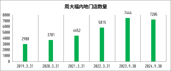 財報顯示,2019年3月31—2023年9月30,周大福內(nèi)地門店數(shù)量從2988家狂飆到7799家,量級膨脹主要得益于三線及以下低線城市的助力。