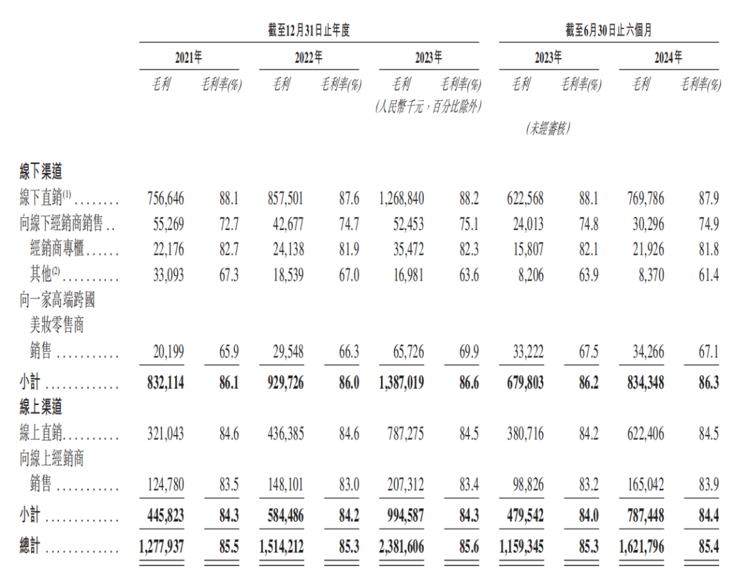 但高端的定位賦予了毛戈平超越同行的盈利能力。招股書顯示,2021-2024年上半年,毛戈平的毛利分別為13.16億元、15.33億元、24.48億元和16.73億元;毛利率分別為83.4%、83.8%、84.8%和84.9%。