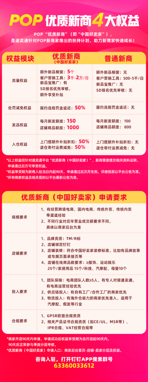 根據(jù)招商會(huì)現(xiàn)場(chǎng)的海報(bào),本輪新商扶持政策覆蓋“POP”和“全托管”,商家只需申請(qǐng) “優(yōu)質(zhì)新商”,通過(guò)后就可以直接享受各項(xiàng)權(quán)益。