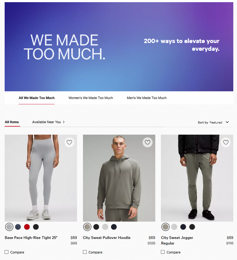 lululemon的創(chuàng)始人Chip Wilson曾表示,“我們的產品售價為普通產品的3倍,但我們不會去打折”。但現(xiàn)在,lululemon的美國官網推出了“We Made Too Much(我們做太多了)”專區(qū),專區(qū)商品折扣可以達到5折。官網還顯示,新注冊的消費者,可以享受15%的商品折扣。